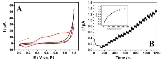 L-cysteine has been suggested as a potential biomarker associated with the progression of SARS-CoV-2 disease []; thus, its detection is a potentially important tool for assessing the outcomes of COVID-19. Initially, the detection of L-Cys was evaluated by CV in 0.1 mol L−1 PBS (pH 6.0) in the presence of 500 μmol L−1 of L-Cys at 50 mV s−1 (Figure 3A).