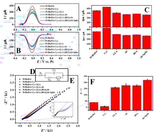 SWV voltammograms at (A) direct and (B) reverse. (C) Graph of peak current after each modification step, obtained from (A,B). (D) The equivalent circuit used for simulation of the experimental data, in the presence of redox couples: Rct, electron-transfer resistance; Rs, the resistance of the electrolyte solution; Cdc, is the double-layer capacitance and; W, Warburg impedance. (E) Nyquist diagram (F) Graph of peak current after each modification step, obtained from (D). Platinum-printed electrode (Pt/BioPET), Pt/BioPET-cysteamine (Pt/BioPET-CYS), Pt/BioPET-CYS-glutaraldehyde (Pt/BioPET-CYS-GLA), Pt/BioPET-CYS-GLA-antibody (Pt/BioPET-CYS-GLA-Ab), Pt/BioPET-CYS-GLA-(BSA) antibody (Pt/BioPET-CYS-GLA-(BSA)Ab) and Pt/BioPET-CYS-GLA-(BSA) Ab-SARS-CoV-2 Spike Protein (Pt/BioPET-CYS-GLA-(BSA)Ab-Spike).