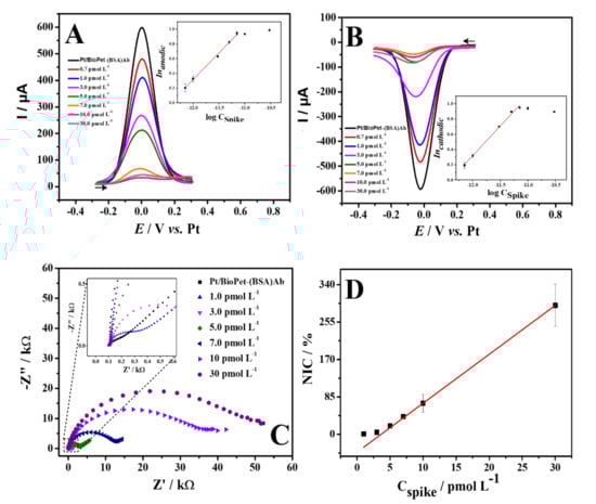 For SWV, a linear behavior was obtained over a concentration range from 0.7 to 7.0 pmol L−1, following the equations: In (anodic) = 9.02 + 0.725 logCspike (pmol L−1), with R2 = 0.994, and In (cathodic) = 9.67 + 0.779 logCspike (pmol L−1), with R2 = 0.993 (Figure 5A,B). This behavior in terms of the concentration in logarithmical form is similar to other works using voltammetric immunosensors [,] that describe an adsorptive effect for the antigen-antibody complex formation after the concentration increases. The limit of detection (LOD) was from 0.70 pmol L−1, which corresponds to the first detectable concentration of spike protein, as presented in the literature [,]. It is possible to observe the decay of the peak current and the increase in the Rct with increasing protein concentration, leading to suppression of the redox probe signal. In addition, the immunosensor can be easily used as a qualitative sensor, i.e., as an on-off sensor, which presented a dissociation constant (Kd) of 1.75 ± 0.21 pmol L−1 [,]. This is possible because the sensor application depends on its selectivity during the immunocomplex formation, independent of the protein concentration.