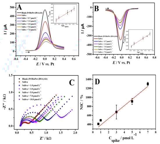 Saliva as a common means of transmission of SARS-CoV-2 and other infectious diseases [] and as a non-invasive method of analysis was used for our work. Thus, the analytical performance of the immunosensor was evaluated in synthetic saliva at known concentrations of spike protein. SWV and EIS measurements were recorded in the presence of 5.0 mmol L−1 [Fe(CN)6]3−/4− at concentrations of 0.7 to 7.0 pmol L−1 and 1.0 to 10 pmol L−1 of the spike protein, respectively (Figure 6). The analytical curves obtained in saliva showed similar behavior to those in PBS media, with a linear decrease in the anodic (R2 = 0.983) and cathodic currents (R2 = 0.983) for SWV (Figure 6A,B), and a linear increase in the impedimetric response (R2 = 0.967, Figure 6C,D).