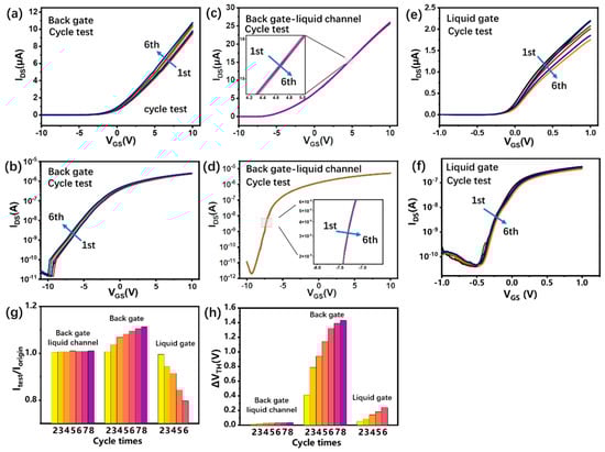 Results of cyclic tests in three modes. The transfer characteristics cycle tests of InSe-FET in (a,b) back gate dry channel, (c,d) back gate liquid channel, (e,f) and liquid gate in linear and logarithmic coordinates. The current (g) and threshold voltage (h) evolution of three modes with cycle times.Note: In back gate working mode, the point at VDS = 0.1 V, VGS = 10 V is selected to compare output current change and threshold shift; in liquid gate working mode, the point at VDS = 0.1 V, VGS = 1 V is selected to compare output current change and threshold shift.