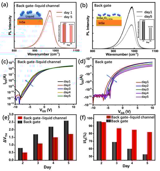 PL spectra of InSe before and after storage for five days in (a) liquid and (b) atmosphere. Transfer curves before and after storage for five days in (c) air and (d) liquid. (e) The threshold voltage shift and (f) the output current change at VGS = 10 V for the InSe-FETs over storage time.