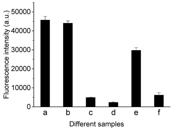 Fluorescence intensities of samples containing different reagents: (a) FDNA; (b) FDNA and BDNA; (c) MB; (d) MB and AFB1; (e) MB and cDNA and (f) MB, cDNA and AFB1. Concentrations of FDNA, BDNA and MB were 20 nM. Concentration of AFB1 was 500 nM. Excitation and emission wavelengths set for fluorescence measurements were 485 nm and 518 nm.