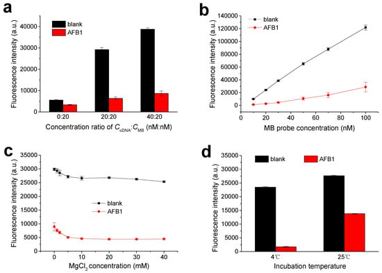 Optimizations of experimental conditions. (a) Fluorescence intensity of samples with or without AFB1 obtained with different concentration ratios between cDNA and MB; (b) fluorescence intensity of samples with or without AFB1 obtained with different concentrations of MB, when ratio value of CcDNA:CMB was fixed at 1:1; (c) fluorescence intensity of samples with or without AFB1 using assay buffer containing different concentrations of MgCl2 and (d) fluorescence intensity of samples with or without AFB1 under different incubation temperatures.