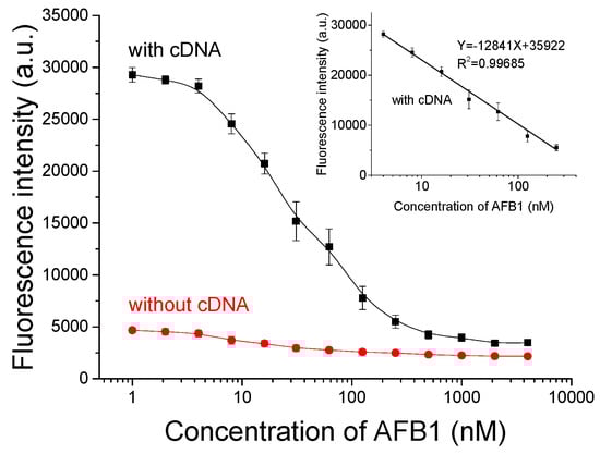 Under optimal conditions obtained above, we detected different concentrations of AFB1 using this MB with or without cDNA, respectively. As Figure 3 shows, with the assistance of the cDNA chain, the MB generated a much higher initial fluorescence intensity before the addition of AFB1, in comparison to that without cDNA assistance. Additionally, a more-than-ten-times-larger decrease in fluorescence intensity caused by the addition of AFB1 was observed when cDNA was used, which means an enhanced response and better sensitivity. In the concentration range of 1 nM to 125 nM, a linear relationship between fluorescence intensity and AFB1 concentration (Y = 12841X + 35922, R2 = 0.99685, where Y is the fluorescence intensity and X is the logarithm of AFB1 concentration) was obtained with cDNA assistance. The limit of detection (LOD) determined by signal/noise being more than three (S/N > 3) was 1 nM, lower than the LOD (8 nM) obtained without cDNA assistance. This detection performance is better than or comparable to some of the previous literature listed in Table S1. Additionally, this aptasensor shows advantages in easy operation, rapid analysis and large signal change.