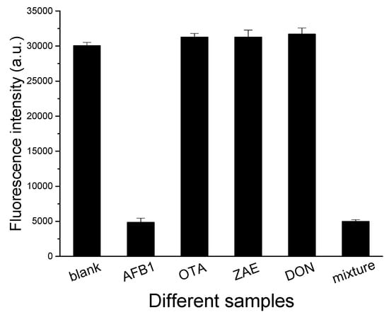 To demonstrate the specificity of this method for AFB1 detection, some non-target mycotoxins were also detected using this method. Results are shown in Figure 4. In comparison with the blank sample, AFB1 addition caused an obvious decrease in the fluorescence intensity. In contrast, the addition of these non-target mycotoxins OTA, ZAE and DON caused a neglectful change in fluorescence intensity, compared with the blank sample. Co-exists of these non-target mycotoxins had no interference on AFB1 detection. These results imply a good specificity of this method toward AFB1.