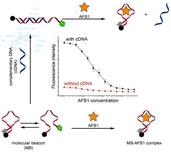 Picture illustrating the principle of this proposal. With the assistance of a complementary DNA (cDNA) strand, the molecular beacon (MB) hybridizes with the cDNA to form a duplex structure, in which FAM labeled at its 3′ end is apart from BHQI labeled at its 5′ end, and there is no fluorescence quenching. Upon the addition of AFB1, the MB prefers to bind with AFB1 rather than cDNA, and adapts into a hairpin structure in which FAM and BHQI are in close proximity, and fluorescence quenching occurs. Detection of AFB1 can be rapidly achieved by measurement of fluorescence intensity decline. Without cDNA, signal response and sensitivity of the MB probe are weak.