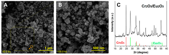 FE-SEM micrographs of cauliflower-like Cr2O3/Eu2O3 (A) magnification 50 kx, (B) 100 kx and (C) X-ray diffraction pattern of the prepared nanocomposite. As a reference, the patterns of standard Cr2O3 (JCPDS #96-210-4123) and Eu2O3 (JCPDS #96-101-1288) were given below the sample pattern.