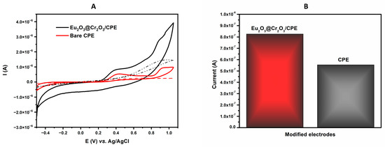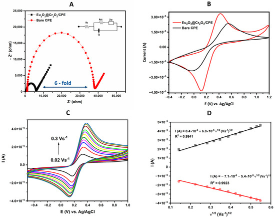 Electrochemical impedance spectroscopy (EIS) is broadly used for assessing a modified electrode’s charge-transfer ability. This method can give information on conductivity/resistance-related properties of the electrode system, such as double-layer capacitance or diffusion rate [35]. EIS measurements were conducted in the 5 mM redox probe containing [Fe(CN)6]3−/4− and 0.1 M KCl as a supporting electrolyte, while the frequency range was from 0.01 to 100,000 Hz and the amplitude was 5 mV. Rct values of CPE and Eu2O3@Cr2O3/CPE (Figure 2A) were 36,430 Ω and 5124 Ω, respectively. An approximately six-fold decrease in Rct was observed for Eu2O3@Cr2O3/CPE, implying an improved material capability to promote interfacial electron transfer. The electrocatalytic activity of Eu2O3@Cr2O3 and the extensive surface area of the electrode most likely contribute to the fast electron transfer and enhanced conductivity. Furthermore, the proposed material is characterized by a porous structure and additional catalytic sites, which contribute to better ion diffusion and ion/electron transport, as confirmed by the linear part of the EIS spectra.
