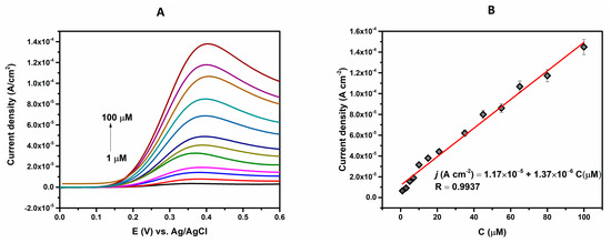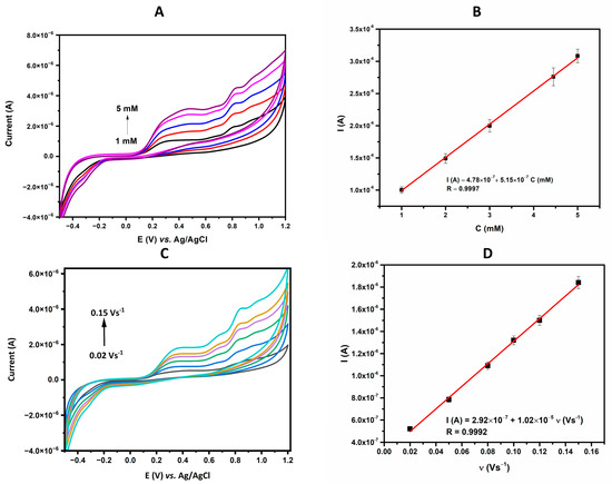 The effects of scan rate on the peaks currents were also investigated (Figure 2C) and further used to evaluate the electrochemical surface area of the modified electrode. Both peaks’ current intensities increased with the rise of the scan rate from 0.02 to 0.3 V s−1 (Figure 2C). Furthermore, a linear dependence is observed when the current intensity values are plotted as a function of the square root of the scanning rate. The following equations can describe these linear dependences: I (A) = 8.4 × 10−6 + 6.8 × 10−5 υ1/2 (V s−1)1/2 (R = 0.9941) for Ipa, and I (A) = −7.1 × 10−6 − 5.4 × 10−5 υ1/2 (V s−1)1/2 (R = 0.9947) for Ipc. These observations indicate the diffusion-controlled nature of the reactions occurring on the Eu2O3@Cr2O3-modified CPE. The Randles–Sevick equation, for the reversible electrode process, was employed for the estimation of the electroactive surface of the modified electrode: Ia = 2.69 × 105 × n2/3 × A D1/2 × ν1/2 × C, where Ia is the anodic current peak (A), n stands for the number of electrons transferred in the redox reaction, A is the electroactive area (cm2), D is the diffusion coefficient (6.1 × 10−6 cm2 s−1), ν is the scan rate (V s−1), and C is the concentration (mM). The calculated surface area for Eu2O3@Cr2O3/CPE was 0.029 cm2.