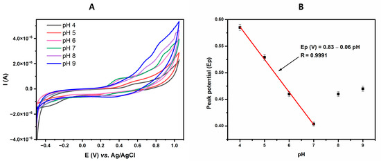 Effects of different pH values of the supporting solution on the electrocatalytic activity of L-DOPA over Eu2O3@Cr2O3/CPE were also investigated. For this purpose, BRBS solutions with different pH values (from 4 to 7) containing 100 µM L-DOPA were used. The acquired voltammograms (Figure 5A) present the changes in peak current intensity and peak potential, depending on the pH value. The peak potential (Epa) shows linearity within the pH range from 4 to 7, followed by the linear regression equation: Epa = 0.8314–0.0613 pH (R = 0.9982). Moreover, the slope value of 61.13 mV/pH is very close to the theoretical Nernstian slope value (−59 mV/pH), indicating that the same number of protons and electrons are involved in the electrochemical oxidation reaction of L-DOPA at Eu2O3@Cr2O3/CPE.
