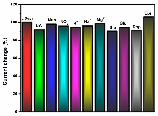 When developing a new analytical method for detecting a specific analyte, it is necessary to examine the selectivity of the proposed sensor. Our research investigated organic compounds commonly present in L-DOPA tablets (mannitol (Man), starch (Sta), and glucose (Glu)) and agreeable metal ions (K+, Mg2+, Na+) as interfering species. Furthermore, we examined the influence of compounds potentially present in a biological matrix (uric acid (UA), dopamine (Dop), and epinephrine (Epi)) on sensor response toward L-DOPA. We added a certain amount (300 µL) of interference standard solutions (1 × 10−4 M) to the 30 mL L-DOPA solution (BRBS, pH 7) with a concentration of 1 × 10−6. This way, interference concentrations equivalent to the concentration of the L-dopa solution were achieved. Although it is almost impossible to find interfering substances in real samples at such a concentration, we wanted to show that even at high concentrations, the electrode is highly selective for the desired analyte. Figure 7 shows the change in the current intensity of the oxidation peak of L-DOPA after adding the tested interfering substance. Examined cations and anions, mannitol, glucose, and uric acid did not interfere with L-DOPA determination; the reductions in analyte current were less than 5%.