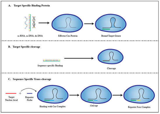 Step mechanism used by the CRISPR-Cas system to identify, isolate, and/or knockout a gene sequence. (A) Target-specific binding: The process of acquiring a spacer starts with Cas1 and Cas2 recognizing the invasive DNA and cleaving a protospacer. In order to replicate the direct repeat and repair the CRISPR, the protospacer is ligated to the direct repeat next to the leader sequence. The Cas protein that is catalytically inactive is bent to the target gene, which is complementary to gRNA. (B) Biogenesis and target-specific cleavage: The CRISPR sequence must be converted into CRISPR-RNA (crRNA), which later directs the Cas nuclease to the target during the interference stage. The crRNA is first produced as a single lengthy transcript that covers the majority of the CRISPR array. The Cas proteins then split this transcript into crRNAs. The way that different CRISPR-Cas systems create crRNAs varies. The target gene is cleaved by Cas proteins thatare followed by sequence-specific binding. (C) Sequence-specific trans cleavage: The Cas protein non-specifically cleaves the ssDNA or ssRNA upon binding to the target gene, thereby freeing the reporter probe.