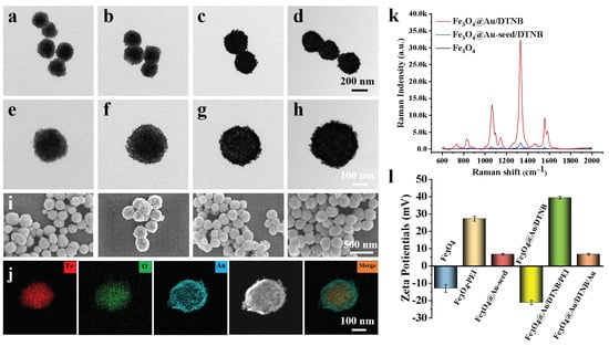 Structure characterization of Fe3O4@Au/DTNB/Au/4-MPBA. TEM images of (a) Fe3O4, (b) Fe3O4@Au-seed/DTNB, (c) Fe3O4@Au/DTNB, (d) Fe3O4@Au/DTNB/Au/4-MPBA tags, and their corresponding magnified TEM images in (e), (f), (g), and (h), respectively. (i) SEM images of (a–d). (j) EDS elemental mapping images of Fe3O4@Au/DTNB/Au/4-MPBA. (k) SERS signal intensities of Fe3O4, Fe3O4@Au-seed/DTNB, and Fe3O4@Au/DTNB. (l) Zeta potentials of Fe3O4, Fe3O4−PEI, Fe3O4@Au-seed, Fe3O4@Au/DTNB, Fe3O4@Au/DTNB/PEI, and Fe3O4@Au/DTNB/Au.