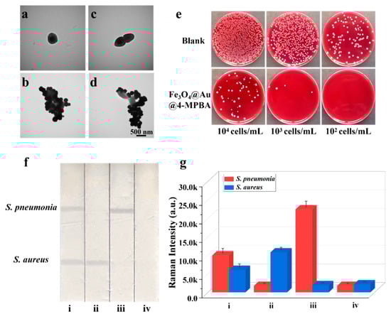 TEM images of (a) S. aureus, (b) S. aureus captured by Fe3O4@Au/DTNB/Au/4-MPBA, (c) S. pneumonia, and (d) S. pneumonia captured by Fe3O4@Au/DTNB/Au/4-MPBA. (e) Photographs of bacteria capture, the colonies on blood agar plates represent the amounts of remaining S. aureus and S. pneumonia in the supernatant after being captured by Fe3O4@Au/DTNB/Au/4-MPBA MNPs, the concentrations of bacteria ranged from 104 cells mL−1 to 102 cells mL−1. (f) Images and (g) corresponding SERS intensities of Fe3O4@Au/DTNB/Au/4-MPBA-LFA with different concentrations of S. aureus and S. pneumonia: (i) 105, 105 cells mL−1; (ii) 105, 0 cells mL−1; (iii) 0, 105 cells mL−1; and (iv) 0, 0 mL−1.