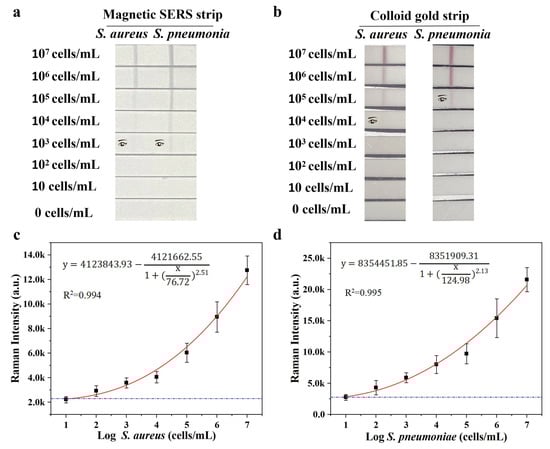 To access the sensitivity and selectivity of our system, different concentrations of S. aureus and S. pneumoniae from 0 to 107 CFU mL−1 were mixed with Fe3O4@Au/DTNB/Au/4-MPBA tags and then detected by Fe3O4@Au/DTNB/Au/4-MPBA-LFA strips. As shown in Figure 3a, with the decreasing concentration of target bacteria, the color of the test lines gradually shallowed. It could be observed with the naked eyes that the visualization concentrations of target bacteria were 10 and 103 cells mL−1, respectively. Moreover, the SERS signal intensities of test lines at 1331 cm−1 increased with increasing bacterial concentration, the calibration curves of two test lines displayed dynamic relationships between SERS intensities and the concentrations of target bacteria and the correlation coefficients (R2) were 0.994 and 0.995 for S. aureus and S. pneumoniae, respectively (Figure 3c,d). Based on the calculation of blank SERS signal, LODs of Fe3O4@Au/DTNB/Au/4-MPBA were determined to be 8 and 13 cells mL−1 for S. aureus and S. pneumoniae, respectively, according to the International Union of Pure and Applied Chemistry (IUPAC) protocol (LOD = mean SERS signal intensities of blank groups + 3 × standard deviation of the control) [36]. We compared our method with standard colloidal gold (AuNP)-LFA method, the preparation of colloidal AuNPs was displayed in supporting information S2, the visualization concentrations of S. aureus and S. pneumoniae were 104 and 105 cells mL−1 for AuNP-LFA strip detection, respectively (Figure 3b). Therefore, our detection system Fe3O4@Au/DTNB/Au/4-MPBA-LFA presented excellent sensitivity.