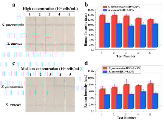 Reproducibility of Fe3O4@Au/DTNB/Au/4-MPBA-LFA strips for target bacteria at concentrations of (a) 106 and (c) 104 cells mL−1, respectively, and corresponding SERS intensities (b,d) on the test lines.