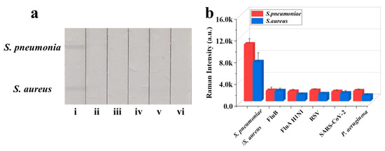 (a) Specificity of Fe3O4@Au/DTNB/Au/4-MPBA-LFA strips for target bacteria at concentration of 105 cells mL−1: (i) S. pneumoniae/S. aureus; (ii) FluB; (iii) FluA H1N1; (iv) RSV; (v) SARS-CoV-2; and (vi) P. aeruginosa. (b) Corresponding SERS intensities for S. aureus, S. pneumoniae, and other negative samples.
