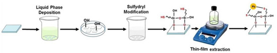 In the preparation of the functionalized sulfhydryl Al(OH)3 layer, the glass sheet with the Al(OH)3 layer was placed into an ethyl acetate solution containing 1~5 wt% MPTS, which was used as a silane coupling agent, and then sealed at room temperature for 24 h. The functionalized layer (Al(OH)3-SH) was washed using ultra-pure water and dried at 60 °C for use. In the enrichment of Pb2+, as shown in Figure 1, after being thiol functionalized, Al(OH)3-SH was used to extract Pb2+ in the sample solution. The extraction conditions were set as follows: extraction temperature at 40 °C, extraction time of 15 min, and stirring speed at 800 rpm. After extraction, the glass sheet was taken out, washed with ultra-pure water, and dried in a drying oven at 60 °C.