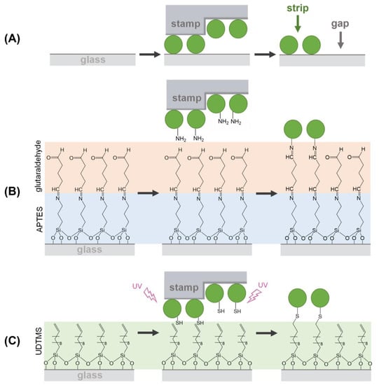 The glass slides used as substrates were washed by sonication (5 min) in ethanol (30% in milli-Q water) and dried under a stream of air. To functionalize their surface, they were irradiated with a 347 nm UV-lamp (UVOH 150 lab, FHR Anlagenbaum GmbH, Ottendorf-Okrilla, Germany) for ten minutes to generate hydroxyl groups (Figure S1A). Then, the hydroxyl-activated substrates were immersed into 1% (v/v) solutions of organosilanes (UDTMS or APTES) in toluene for 30 min and under orbital agitation. After silanization, the substrates were rinsed with acetone and air-dried. Thereafter, substrates were cured at 80 °C for 30 min, rinsed with acetone, and dried as before.
