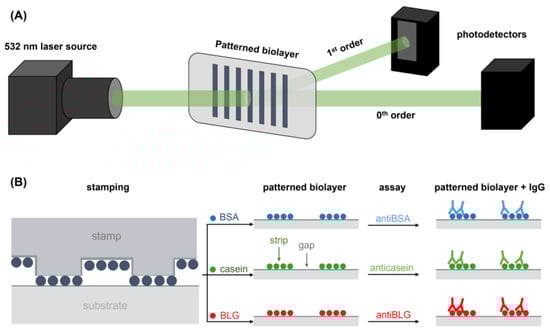Schemes of (A) the optical setup employed to perform the diffraction measurements and (B) the fabrication by µCP of the BSA, casein, and BLG patterns employed for the quantification of specific IgG.
