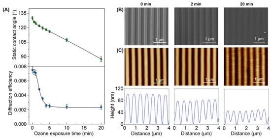 Effect of the UV-ozone exposure on the PDMS grooved structure. (A) Evolution of the surface hydrophobicity (top) and the diffractive response (bottom) for increasing exposure times. (B) FESEM images (see Figure S3 for larger scans). (C) AFM images (top) and their corresponding height profiles (bottom).