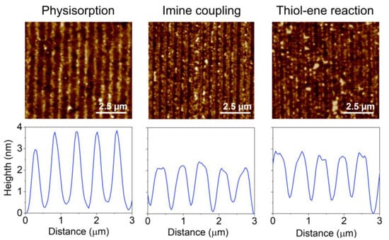 In addition to classical µCP strategies based on physisorption, alternative chemical couplings can also be implemented to attach the patterned biomolecules to the host substrate. In this section, we explore and compare different physisorption and covalent ways to create submicron one-dimensional patterns of proteins by µCP, using BSA as a representative model system.