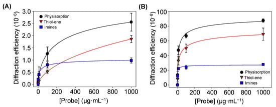 Finally, the amount of BSA proteins patterned by physisorption, imine coupling, and thiol-ene reaction were compared. For that, increasing concentrations of BSA were employed as inking solutions, and then the diffraction efficiency of each pattern was measured (Figure 6A). At low concentrations (0–10 µg·mL−1), the physisorption and imine approaches displayed similar responses (Figure S7). However, for higher protein concentrations, the diffraction efficiency of the patterns fabricated by physisorption was about 2.5 and 1.5 times greater than that for imine coupling and thiol-ene reaction, respectively. These results suggest that a higher number of proteins is transferred to the substrate by µCP combined with physisorption, which also correlates with the strip thicknesses observed in Figure 5.