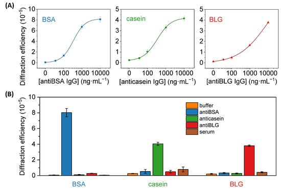 (A) Dose-response immunoassay curves obtained with diffractive patterns of BSA, casein, and BLG, after the incubation of a range of concentrations of specific IgG solutions (antiBSA, anticasein, and antiBLG, respectively). Experimental data were fitted to a sigmoidal regression (4-parameter logistic, R2 = 0.999 in all cases). See Figure S9 for a zoomed view of the graphs in their low-concentration range. (B) Diffraction efficiencies achieved in BSA, casein, and BLG patterns after incubating PBST (buffer), 10 µg·mL−1 of specific antiBSA, anticasein and antiBLG antibodies in buffer, and human serum.
