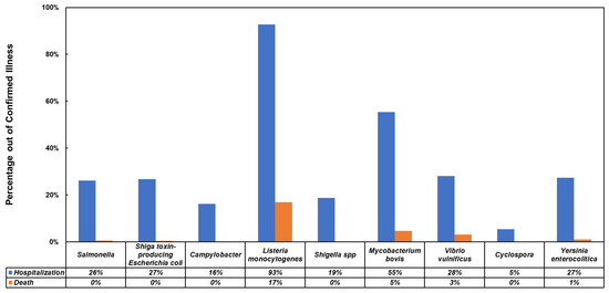 - Foodborne Diseases Active Surveillance Network. Foodborne Diseases Active Surveillance Network (FoodNet): FoodNet Surveillance Reports for 1996–2020 (Final Reports); U.S. Department of Health and Human Services, CDC: Atlanta, GA, USA, 2021. [Google Scholar]