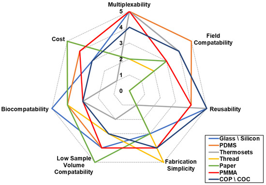 The characteristics of a microfluidic channel are derived from the material used to fabricate them. The channel’s biocompatibility, reusability, fabrication simplicity, and cost are among the first characteristics that come to mind when considering a microfluidic channel for electrochemical biosensor use. In addition to the qualities that are important, their ability to be used in the field, the use of low sample volume, and compatibility to be used with multiple different pathogens (multiplexability) will make a huge impact when they are considered as a viable solution for detection in industrial settings [51,52,53,54]. Focus on microfluidics for foodborne pathogen electrochemical detection since 2017 has shown that the main materials used are glass [55], polydimethylsiloxane (PDMS) [16,17,19,20,56], thermosets [18], paper [57], and thread-based [58]. In addition, there are also other materials that should be considered as microfluidic channel fabrication materials, although not as common such as polymethylmethacrylate (PMMA), cycloolefin polymer (COP), cyclic olefin copolymer (COC), and silicon. These characteristics were evaluated on a scale of 1–5 and are presented in Figure 2 as per channel material, while the details leading to the evaluation are presented below. Some microfluidic channels can be made by the combination of two or more materials and their characteristics will change accordingly. Figure 2 further explains the popularity of glass and PDMS since both display preferable traits in most categories.