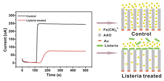 In the amperometric actuator model, the current is produced through an oxidation–reduction reaction with the simultaneous transfer of electrons between chemical species [9]. Previously, Zhou and co-workers designed an amperometric method for analyzing L.M. particles (Figure 1). They applied permeable anodic (aluminum oxide) film conjugated with a specific aptamer for the evaluation of bacterial particles. They reported a significant reduction in current based on the penetration of the probe from the film that was blocked with L.M. bacilli onto the detection layer. This study exhibited a sensitivity detection limit of 102 CFU/mL during a 10-min period [36].