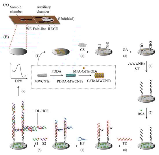A schematic illustration of a genosensor with integrated electrodes that sense target DNA using a double linear hybridization chain reaction (DL-HCR) technique and short signal DNA probe pairs. (A) Graphical presentation of the developed chip and (B) Preparation steps of the genosensor. Copyright (2022) from ACS publications [70].