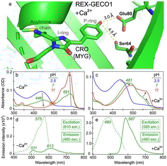 Calcium ions (Ca2+) serve a diverse array of functions in living systems, including cellular signaling and regulating biochemical processes as ubiquitous secondary messengers [1,2,3]. Calcium sensing is of particular interest to the neuroscientific community because measurements of free cellular calcium can be a relatively direct correlation to neuronal activity [4,5,6,7]. Combined with recent innovations in modern imaging techniques, fluorescence microscopy has become an integral toolset to map out the neuronal circuitry in vivo [8,9,10,11]. On the indicator side, the continued improvement of genetically encodable biosensors has allowed for noninvasive techniques to image deep tissue in a living organism with (sub)-cellular specificity [12,13,14,15]. There are several desirable properties for genetically encoded calcium indicators (GECIs) that include a large dynamic range and Stokes shift, long emission wavelength, enhanced affinity for calcium ions over other similar ions, and fast response time [10,16,17,18]. Among the calcium biosensors, there are primarily two types of indicators: Förster resonance energy transfer (FRET) between a pair of biosensors, and the GECI called GCaMP (with GFP, calmodulin/CaM, and a myosin light-chain kinase M13 peptide) types [19,20,21,22,23,24,25]. The latter indicator relies on the Ca2+-mediated modulation of the fluorescence properties of a single biosensor as the fluorophore [23,24,26,27,28], while the tyrosine-derived FP chromophore is the photosensory core and emitting species. In addition to the aforementioned properties, a ratiometric (either excitation or emission) indicator is preferred to alleviate undesirable experimental artifacts from complex experimental conditions. While FRET-based biosensors are intrinsically ratiometric, they often suffer from relatively small dynamic ranges. Therefore, many GCaMP-type single FP-based ratiometric Ca2+ indicators have been engineered with superior dynamic ranges including GEX-GECO1, GEM-GECO1, and Y-GECOs (GECO stands for genetically encodable calcium indicators for optical imaging) [23,29,30,31,32,33].