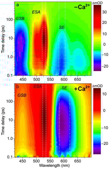 In order to better explain the appearance of the deprotonated emission peak under near-UV to visible light, we performed fs-TA experiments on the Ca2+-free and -bound REX-GECO1 biosensors with 400 nm excitation to compare to the previously reported 480 nm excitation results [18]. In addition to achieving a more exclusive excitation of the A form with 400 versus 480 nm light (i.e., on the blue edge versus red edge of the A form absorption band, see Figure 1b), the bluer excitation with a wider spectral window allows for analysis of the photoexcited protonated form’s ground-state bleaching (GSB) for both the Ca2+-free and -bound biosensors as well as a potential protonated (A*) form’s stimulated emission (SE) band. In Figure 2, the fs-TA spectral contour plots of the Ca2+-free and -bound REX-GECO1 exhibit primarily three features following 400 nm excitation: GSB from ~420–475 nm, excited-state absorption (ESA) from ~475–550 nm, and SE from ~550–700 nm. For the Ca2+-free (Figure 2a) and Ca2+-bound (Figure 2b) cases, it is readily apparent that the deprotonated form’s SE band is much stronger when the biosensor is bound to calcium ions. This observation alone indicates that the Ca2+-bound biosensor undergoes ESPT to a much larger degree than the Ca2+-free counterpart even when considering the possibility of direct excitation of B form because there is a greatly reduced deprotonated chromophore (B) population at neutral pH for the Ca2+-bound biosensor (Figure 1c) than the Ca2+-free biosensor (Figure 1b).