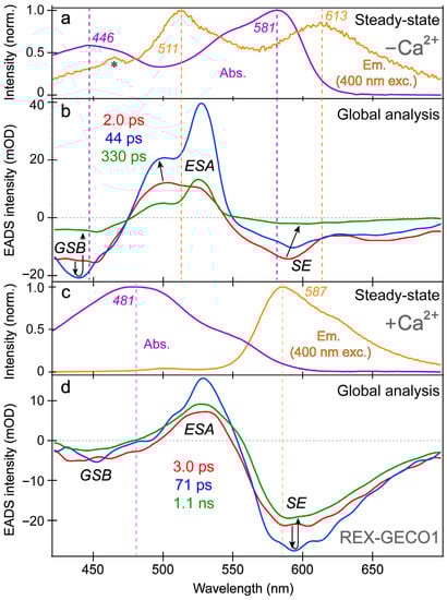 The spectral overlap of the fs-TA transient features, especially for the Ca2+-free biosensor chromophore at neutral pH (Figure 3a,b), requires global analysis [69,70,71] to dissect the energy dissipation pathways following 400 nm excitation, supporting the aforementioned discussions of distinct electronic features (mainly the ESA and SE) and their dynamics. In contrast, for the Ca2+-bound biosensor (Figure 3c,d), a sequential model in global analysis yields the evolution-associated difference spectra (EADS), which display both ESA and SE features with visually similar dynamics, including a ~3 ps time constant (red→blue trace in Figure 3d). This process is assigned to ESPT upon excitation of the protonated chromophore (A form) due to the similar position and lineshape of the SE compared to the spontaneous fluorescence (Figure 3c). As shown in global analysis (Figure 3d) and 2D-contour plot (Figure 2b), the deprotonated form SE feature promptly rises due to an ultrafast ESPT within the cross-correlation time of the instrument because there is minimal deprotonated population at pH 7 (Figure 1c), although direct excitation of the deprotonated chromophore may still occur to a minor degree in this biosensor state. Following the concomitant rise of the ESA/SE bands, both transient spectral features decay with an ~71 ps time constant (blue→green trace in Figure 3d) assigned to nonradiative relaxation, likely including some conformational motions of the chromophore, which are coupled to the local environment rearrangement [38,72]. The final time constant retrieved from global analysis of the Ca2+-bound chromophore is 1.1 ns, portraying the apparent fluorescence lifetime of the chromophore and is typical for moderately fluorescent FPs [38,59,73].