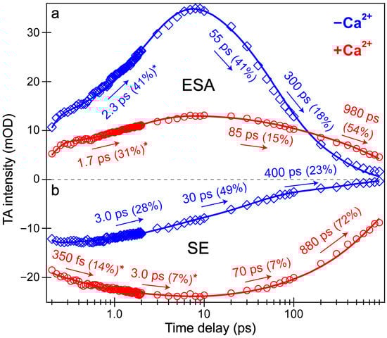 Probe-dependent fs-TA signal intensity dynamics of the (a) ESA and (b) SE features following 400 nm excitation of the Ca2+-free (blue diamonds) and Ca2+-bound (red circles) REX-GECO1 biosensor. Individual data points are overlaid with the least-squares multi-exponential fits (solid curves, color-coded), the retrieved time constants and weighted amplitudes are listed accordingly. The spectral integration regions for the Ca2+-free biosensor’s ESA and SE bands are 520–532 and 581–604 nm, respectively. The spectral integration regions for the Ca2+-bound biosensor’s ESA and SE are 523–535 and 583–620 nm, respectively. The asterisks by certain amplitude percentages indicate the intensity rise components from the best fits.