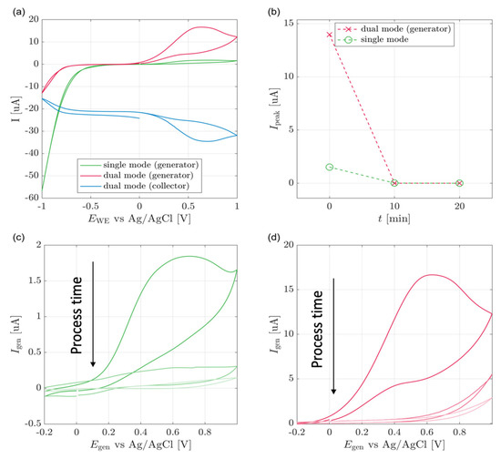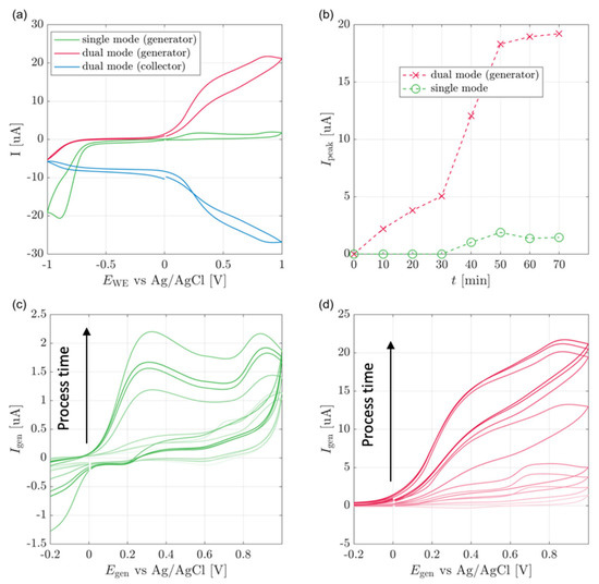 The cell response was studied through eight cyclic voltammetry measurements starting at zero time and every ten minutes (Figure 3b). The peak current relates to the 0.2 V oxidation peak and is calculated by extrapolation of the capacitive current slope and its subtraction from the measured current values. Figure 3c shows the single-WE mode voltammogram obtained in the second cycle for each measurement. The oxidation peak current increased as a function of reaction time from 0 μA up to 2 μA. The same experiments were repeated for dual-WE mode (Figure 3d). Again, a sigmoid-shaped curve was observed at all process times, and the measured current increased over time, and was in the range of up to over 20 μA.