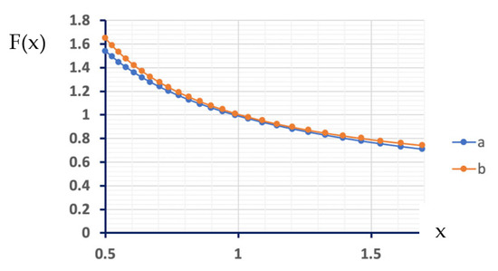 Both functions are shown in Figure 4 in the range of 0.5–1.5, which is near the experimental setup used in the work.