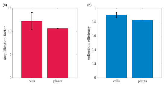 (a) Amplification factors and (b) collection efficiencies measured in experiments with a summary of cell lines and plant model.