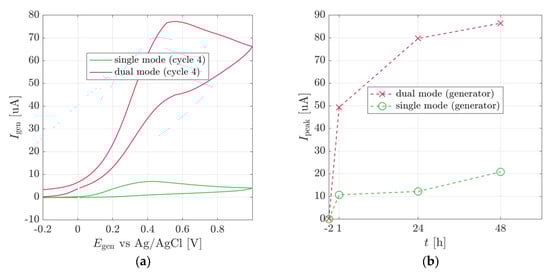Figure 3a displays single and dual-mode voltammograms. The single mode curve shows reduction and oxidation peaks, as described in the introduction. Unlike ideal redox cycling, the dual mode presents a voltammogram where the currents increase with the potential increase. This can be explained by assuming that the redox cycling occurs between the by-products of p-nitrophenol reduction, the concentrations of which continuously increase, thus leading to an increase in the oxidation and reduction currents.