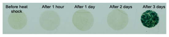 Figure 8 presents the gold-standard method (X-gluc staining) described in the experimental section. Using X-gluc, the heat shock effect was observed three days after applying the stress, significantly longer than the one-hour detection time by electrochemical methods.