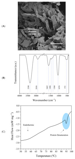 The morphological characteristics of the (bio)materials were evaluated by scanning electron microscopy (SEM; Tescan Vega 3, Japan). The thermal stability and reaction enthalpy data were obtained by differential scanning calorimetry (DSC; TG/DTA—60H, Shimadzu, Kyoto, Japan). Fourier-transform infrared spectroscopy (FTIR; Cary 630, Agilent, Santa Clara, CA, USA) information was used to observe the vibrational modes of functional groups present in the protein structure. UV-visible spectroscopy (Cary 50, Varian, Palo Alto, CA, USA) was also used for qualitative and quantitative tests of protein activity.