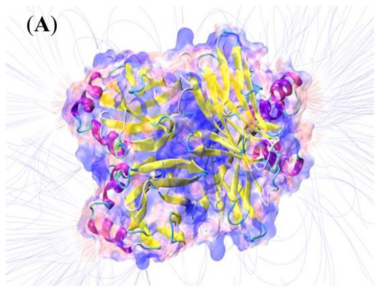 Protein immobilization on electrode surfaces is among the most critical steps for developing biosensors, as the platform must simultaneously combine biocompatibility, response stability, and signal sensitivity in order to be operated under optimal conditions. Therefore, understanding the electrostatic characteristics of the working macromolecule is a fundamental condition, as it allows the most suitable electrode surfaces for the effective immobilization of ABL contained in the fungal extract to be identified. Computational quantum-chemistry results indicated that electrolytic environments with pH ≥ 6.7 (chosen working condition) provide an experimental condition above the pI of lectin isoforms, justifying the net negative charge concentrated in the α-helix regions (yellow segments of the peptide backbone illustrated in Figure 3A) and favoring ABL immobilization on positively charged surfaces. The data also revealed electric field signals around the entire molecular surface (surrounding blue lines), expanding the possibilities of interaction between the electrode material and target protein.