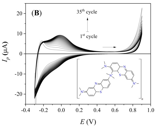 - Kaplan, İ.H.; Dağcı, K.; Alanyalıoğlu, M. Nucleation and Growth Mechanism of Electropolymerization of Methylene Blue: The Effect of Preparation Potential on Poly(Methylene Blue) Structure. Electroanalysis 2010, 22, 2694–2701. [Google Scholar] [CrossRef]
