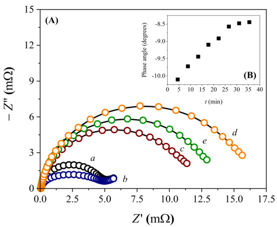 Focusing on detection sensitivity and knowing that the polymer contained in the biosensor had a band–gap of 1.65 eV [27], the photosensitivity of the system under irradiation with a blue LED (470 nm; 10 W power) was evaluated. EIS data obtained over 1 h of irradiation showed a decay in the impedance values (Rct = 12.7 mΩ for 500 nmol L−1 lactose; Figure 4A line e) compared with those obtained in the absence of irradiation. The incident light reduced the recombination rate of photogenerated electron–hole pairs in the polymeric material, making interfacial phenomena more evident and improving the biosensor’s sensitivity. The photoelectrochemical effect reached the equilibrium condition after 30 min of continuous irradiation, as seen by the phase angle values in Figure 4B. This trend was also observed in the Bode plots shown in Figure S3—Supplementary Material. In this case, the ohmic resistance equilibrium was demonstrated by the gradual stabilization of the sigmoid curves formed between impedance and frequency, as well as the peak intensity resulting from the relationship between the phase angle and frequency. These profiles changed in intensity according to the capacitance of the electrical double layer, so the charge transfer became more deficient in the absence of irradiation.