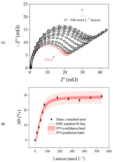 In the above equation, is the percentage difference between the sample and blank phase angles, is the maximum percentage difference in the same variables described before, represents the apparent dissociation constant of the ABL–lactose complex, and is Hill’s coefficient. The limits of detection (LOD) and quantification (LOQ) were calculated from the resulting regression equation coefficients recorded in the smallest linear range studied [38]. Possible charge-transfer resistance oscillations recorded for lactose analysis (1.0 × 10−8 mol L−1) in the presence of different carbohydrates (glucose, fructose, maltose, sucrose, cellulose, and starch) were used as indicative of analytical interference. The method’s precision was analyzed by intraday (n = 10) and interday (n = 5) repeatability tests using 1.0 × 10−8 mol L−1 lactose, and the results are reported as the relative standard deviation (RSD; %). The reproducibility tests followed a similar protocol, but used different devices (n = 3). All assays were performed in triplicate.