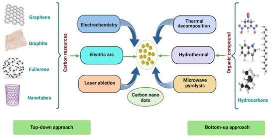 Due to their simplified preparation procedures, top–down approaches are appropriate for the mass manufacturing of CNDs nanomaterials. The top–down approach “cuts” carbon particles including CNTs and graphite into CNDs via an arc discharge, laser ablation, or chemical oxidation [44]. Arc discharge and laser ablation are the most commonly used top–down methods for producing CNDs. Gonçalves et al. used laser ablation in water solution, N-acetyl-l-cysteine, and NH2-polyethylene glycol (PEG200) to create passivated CNDs [45]. Chemical oxidation involves introducing oxygen-containing hydrophilic functional groups into carbon nanostructure complexes by oxidizing them with a potent acid. The carbon nanostructures become water-soluble, which facilitates their discharge into the fluid [46]. Scientists have also produced CNDs by hydrothermally slicing graphene sheets. Wang et al. used graphene oxide as the precursor to create C-dots using the hydrothermal process with microwave assistance. Carbon dots that are hydrophilic, hydrophobic, or even amphiphilic can be made using microwave-assisted synthesis. A simple one-step microwave-assisted synthesis of hydrophobic C-dots was described by Mitra et al. Using glucose as a starting material, Ma et al. reported the ultrasonic synthesis of N-doped C-dots (Figure 2) [47].
