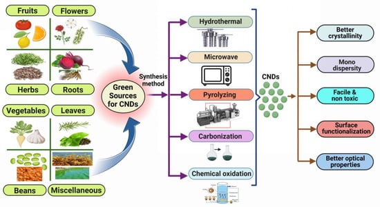 CNDs synthesized from biological sources play a significant role in biomedical and environmental applications, including bioimaging, biosensing, metal ions detection and electrocatalytic oxidations [52]. Green synthesis has attracted the interest of scientists because it is cost-effective, less hazardous, eco-friendly, less time-consuming, and requires lower temperatures (Table 1) [53]. The production of CNDs from mostly reusable substrates includes naturally available raw materials that are relatively cheap and simple to make. CNDs made from natural sources can be used to transform low-value biomass waste into rich and valuable products. The low manufacturing cost and constant availability of raw ingredients for CNDs synthesis have made it a viable procedure for the industry also. Additionally, no dangerous organic solvents are required; instead, an aqueous solution may be used, increasing the CNDs water solubility (Figure 3) [54].