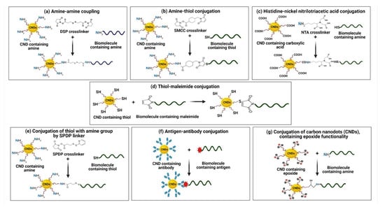 Conjugation of biomolecules with carbon nanodots via different chemistries and cross-linkers. (a) Amine–amine conjugation by using DSP crosslinker. (b) Conjugation via amine-thiol and SMCC as crosslinker. (c) Histidine–nickel nitrilotriacetic acid-based conjugation of biomolecules with CNDs. (d) Conjugation of CNDs with biomolecules by using thiol maleimide. (e) Conjugation of thiol containing biomolecules with CNDs by using SPDP crosslinker. (f) Antigen–antibody-based conjugation of CNDs with biomolecules. (g) Conjugation of CNDs containing epoxide functionality with biomolecules.